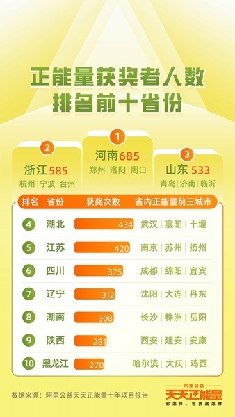 此次公布的縣域名單為首次發(fā)布,依據(jù)十年來天天正能量獲獎者的地域?qū)傩。十年里,正能量獲獎者的地理版圖不斷擴大。截至2022年底,獲獎者已覆蓋全國300多個地級市、1000多個縣級行政區(qū)。獲獎者的身影由大城市日趨向縣域擴展,而河南、浙江、山東、湖北、江蘇、四川、遼寧、湖南、陜西、黑龍江,成為十大獲得正能量獎次數(shù)最多的省份,其中河南獲獎人數(shù)全國第一。