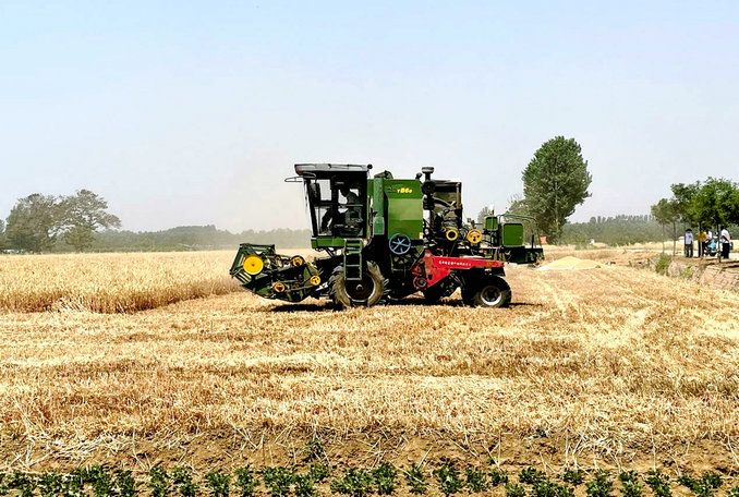 中新河南網(wǎng)6月6日電(張培 趙鑫)6月4日,在襄城縣庫莊鎮(zhèn)大廟村的麥田里,隆隆機聲中,聯(lián)合收割機在麥浪翻滾的田間來回穿梭作業(yè),顆粒飽滿的小麥,歡快的跳進農(nóng)民的“糧袋子”,像跳動的音符,演奏著豐收的樂章。一群穿迷彩服的人在田間忙碌著,為金黃色的麥田增添了一抹別樣的色彩。