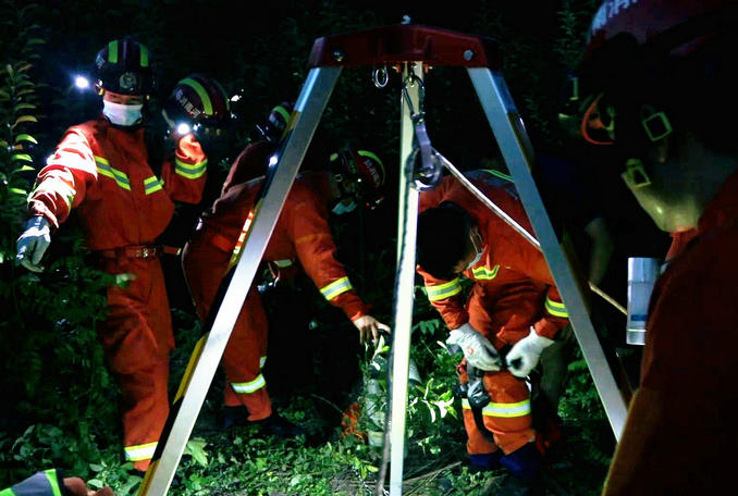 救援人員在井口架設(shè)三腳架,由一名經(jīng)驗豐富的消防員攜帶安全吊帶、頭盔等裝備,采用“倒掛金鉤”的方式索降至井底被困者位置。