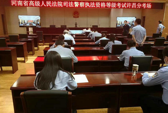 此次考試在全省統(tǒng)一進行,各地法院分別設立考點,省法院法警總隊全程視頻巡考,確?荚、考核的標準和質量。5月21日上午10時,許昌中院考點,全體參考司法警察服從指揮,嚴肅考場紀律,全神貫注,認真答題。