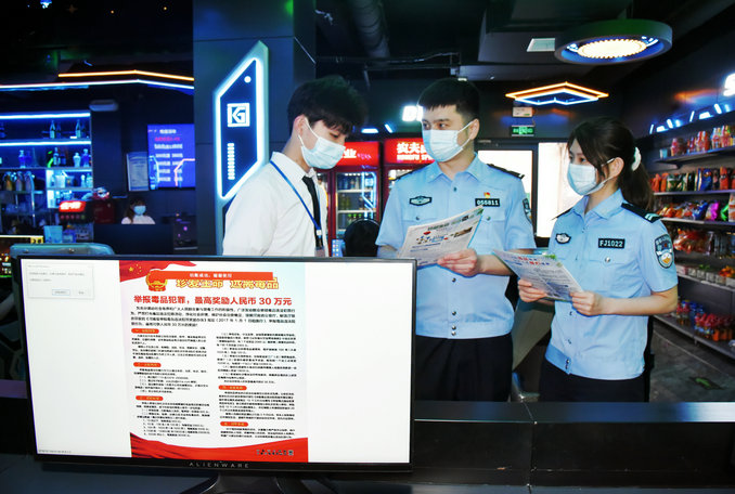 中新河南網(wǎng)6月14日電(張培 曹秀軍)為進一步增強廣大人民群眾的禁毒意識,普及毒品知識、傳播禁毒理念、宣傳禁毒政策、震懾毒品犯罪,在6·26國際禁毒日來臨之際,許昌市公安局魏都分局禁毒大隊聯(lián)合網(wǎng)安大隊進行禁毒“六進”宣傳活動,以市區(qū)網(wǎng)吧為宣傳陣地,在網(wǎng)吧內(nèi)所有電腦登錄頁面顯示《河南省舉報毒品違法犯罪獎勵辦法》,讓每一位網(wǎng)吧上網(wǎng)人員都能看到宣傳界面,大力擴展禁毒宣傳的傳播渠道,有效提升群眾對獎勵辦法的知曉率。
