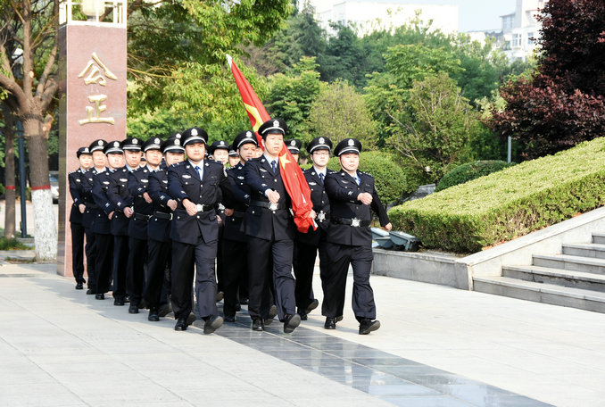 在藍(lán)天和朝陽(yáng)的映襯下,伴隨著激昂的《義勇軍進(jìn)行曲》,鮮艷的五星紅旗冉冉升起,全體干警滿(mǎn)懷敬意地行注目禮。