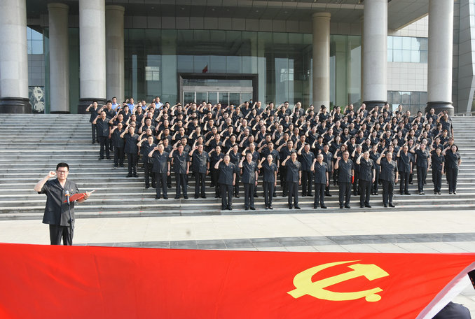 “我志愿加入中國(guó)共產(chǎn)黨,擁護(hù)黨的綱領(lǐng),遵守黨的章程……隨時(shí)準(zhǔn)備為黨和人民犧牲一切,永不叛黨!”隨后,全體黨員干警面向黨旗列隊(duì),高舉右拳莊嚴(yán)宣誓,表達(dá)對(duì)黨的無(wú)限忠誠(chéng)。