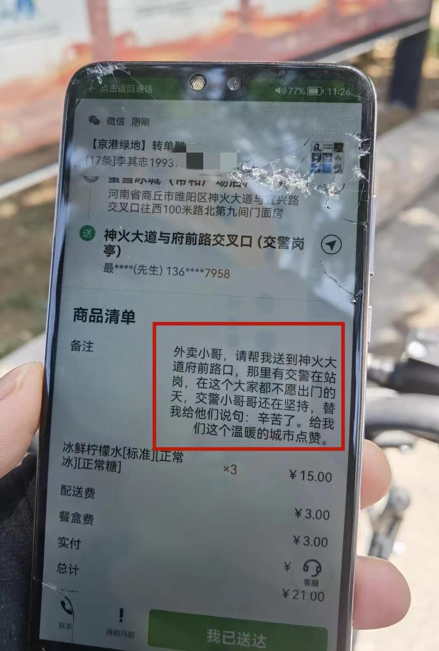 中新河南網(wǎng)商丘6月21日電 (許永強 通訊員 王豪杰)“外賣小哥,請幫我送到神火大道與府前路口,那里有交警在站崗,在這個大家都不愿出門的天,交警小哥哥還在堅持,替我給他們說句辛苦了,給我們這個溫暖的城市點贊。”6月20日,正在商丘市委崗執(zhí)勤交警張向陽收到了外賣小哥送來的一份匿名涼飲。讓張向陽及同事們感到很驚訝,在炎炎夏季,他們也感受到了熱心市民送來的清涼。