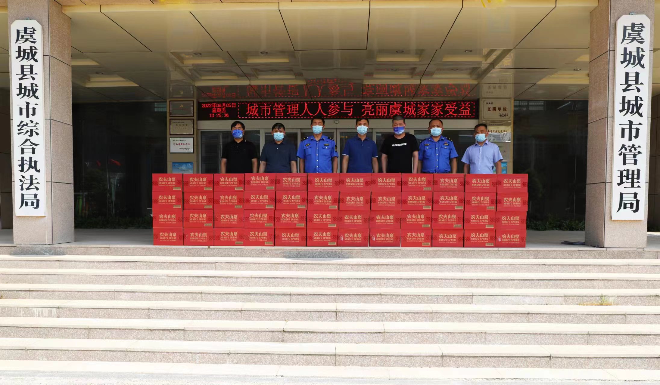 中新河南網(wǎng)商丘8月6日電(刁玉磊 通訊員 賈震)“炎炎夏日,非常感謝環(huán)衛(wèi)工人和城管隊員們,你們?nèi)找箞允乜挂、城市管理工作一線,非常辛苦,向你們表示崇高的敬意。”8月5日,河南商丘市虞城縣愛心人士李大東、趙保險等一行對該縣環(huán)衛(wèi)工人和城管隊員進(jìn)行了慰問,助力新冠肺炎疫情防控和城市管理工作。