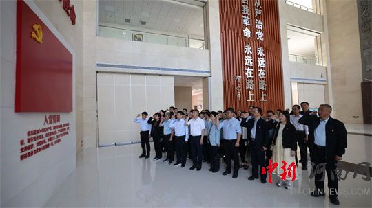 參觀結(jié)束后,全體黨員干部在黨旗前莊嚴重溫入黨誓詞,回顧初心使命。