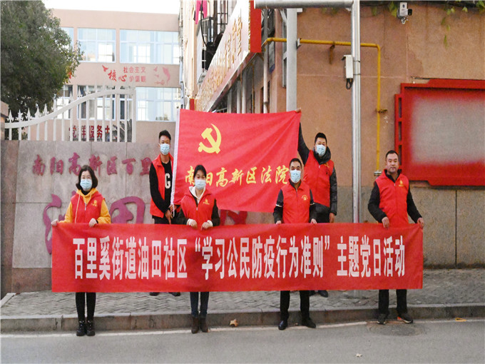 為全力做好疫情防控工作,11月12日下午,中共南陽高新區(qū)法院機(jī)關(guān)支部委員會根據(jù)中共南陽市委組織部統(tǒng)一部署安排召開“學(xué)習(xí)公民防疫行為準(zhǔn)則”主題黨日活動,組織院機(jī)關(guān)黨員同志下沉油田社區(qū)防疫一線,向社區(qū)居民發(fā)放《公民防疫行為準(zhǔn)則》,幫助居民學(xué)習(xí)防疫知識。