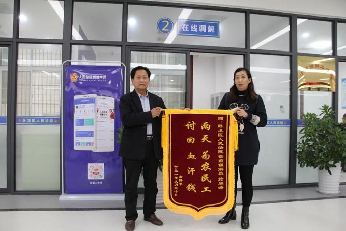 中新河南網(wǎng)10月14日電(李克選 丁清凌 常照軍) “謝謝,真的是太感謝你了,要不是你,真不知道這些錢啥時候才能要回來。”10月9日上午,高某將一面寫著“兩天為農(nóng)民工討回血汗錢”的錦旗送到南陽市臥龍區(qū)人民法院訴前調(diào)解室訴前調(diào)解員於祥濤手中,對該院人民調(diào)解員盡心盡力、高效調(diào)解的工作態(tài)度點贊。