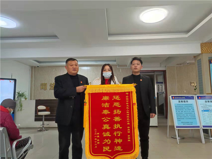 中新河南網(wǎng)12月15日電(李克選 魏錁 張冠)“真是太感謝你們了,拖了這么久的錢終于要回來了!”12月15日上午,申請執(zhí)行人田某專程來到南陽市臥龍區(qū)人民法院,將一面印有“懲惡揚善執(zhí)行神速 廉潔奉公真誠為民”的錦旗送到執(zhí)行干警徐啟明的手中,感激的說道。