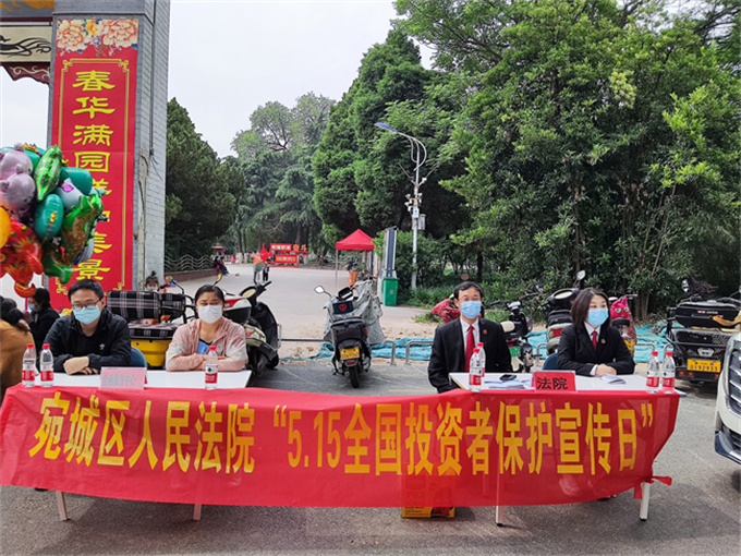 中新河南網(wǎng)5月15日電(李克選 謝叢晨 劉娟)為進(jìn)一步倡導(dǎo)理性投資文化和優(yōu)化法治化營商環(huán)境,形成人人關(guān)心、關(guān)愛、關(guān)注中小投資者合法權(quán)益的良好氛圍,5月15日上午,以第四個(gè)“全國投資者保護(hù)宣傳日”為契機(jī),河南省南陽市宛城區(qū)人民法院聯(lián)合區(qū)金融辦,在市人民公園北門開展《心系投資者 攜手共行動(dòng)——筑牢注冊(cè)制改革基礎(chǔ),保護(hù)投資者合法權(quán)益》主題宣傳活動(dòng)。