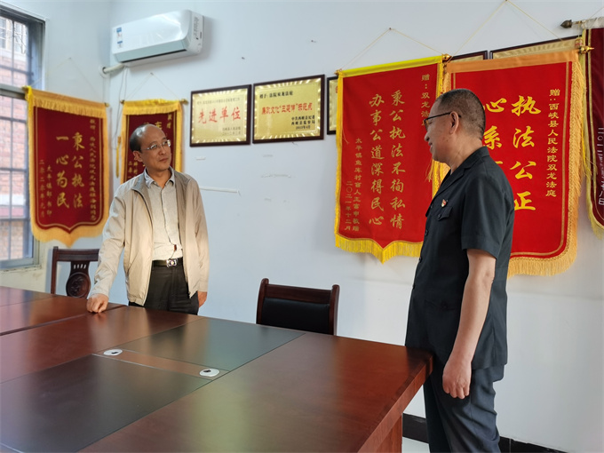 走訪結(jié)束后,王興軍到雙龍法庭進(jìn)行實(shí)地調(diào)研,了解法庭基礎(chǔ)設(shè)施、人員配備及案件收結(jié)情況,對法庭開展“車載法庭”、設(shè)立巡回審判點(diǎn)等做法表示充分肯定,對全國模范法官、全國人民法庭工作先進(jìn)個人、雙龍法庭庭長姬海朝扎根基層司法為民的情懷表示贊揚(yáng)。