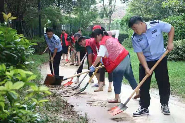 23日一早,周建偉帶領(lǐng)社區(qū)輔警提著水桶、扛著鐵锨來到了受災(zāi)嚴重的社區(qū),積水退去后沉淀滿一米多厚的淤泥、河沙、垃圾等沉淀物,周建偉一行人利用手中的工具一鋤、一鏟的幫助清理,滿頭的汗水浸出臉頰,與黝黑的皮膚混在一塊,泥土灰與公安藍交織一起,成為一道別樣的風(fēng)“警”線?粗蓛舻纳鐓^(qū),周建偉的臉上終于有了笑容。