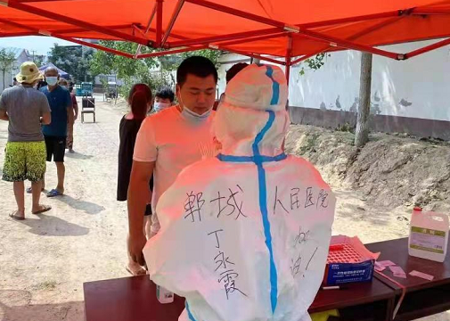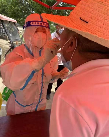 “在商丘的這幾日里,根據(jù)工作需要,不停地在轉(zhuǎn)換工作地點(diǎn),從虞城民安社區(qū)馬莊、丁樓到商丘市區(qū)建業(yè)香檳圣園、建業(yè)•公園里......工作中,一直要穿著密不通風(fēng)的防護(hù)服,熱的喘不過來氣,頭暈?zāi)垦。特別對居家隔離重點(diǎn)人群進(jìn)行核酸檢測采樣時(shí),手里提著消毒液等必備的東西,走步梯,還沒爬到樓上就渾身濕透,每一層樓都是在超越自己,挑戰(zhàn)自己的額體能極限。當(dāng)然,像我們隊(duì)長王坤,我的同事邢艷敏、郭浩、孫永立......每一位醫(yī)務(wù)工作者都是一樣的,都在克服一切困難勇敢向前。”