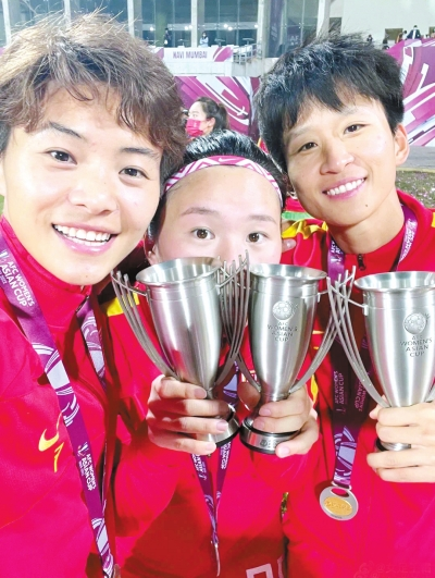 婁佳惠(右一)、王霜(左一)等女足球員慶祝亞洲杯奪冠