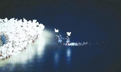 對(duì)于這一創(chuàng)意的靈感來(lái)源,田湉?fù)嘎,按照?dǎo)演團(tuán)隊(duì)的設(shè)計(jì),“放飛和平鴿”環(huán)節(jié)的舞蹈分為兩大結(jié)構(gòu),一是千萬(wàn)雪花的匯聚,孩子們舉著鴿子燈,奔入表演區(qū),呈散點(diǎn)狀進(jìn)行表演;二是孩子們匯聚在雪花臺(tái)周圍,呈現(xiàn)璀璨的愛(ài)心造型,傳遞一種溫暖感,“怎樣回到心形造型上,需要周密的設(shè)計(jì)、細(xì)致的排練。在排練過(guò)程中,我發(fā)現(xiàn)孩子們散得比較開(kāi),有些孩子跑得比較遠(yuǎn),聚攏的時(shí)候,小一點(diǎn)的孩子回來(lái)比較慢。我靈機(jī)一動(dòng),讓一個(gè)大一點(diǎn)的孩子跑出來(lái),把那個(gè)小一點(diǎn)的孩子拉回來(lái)”。