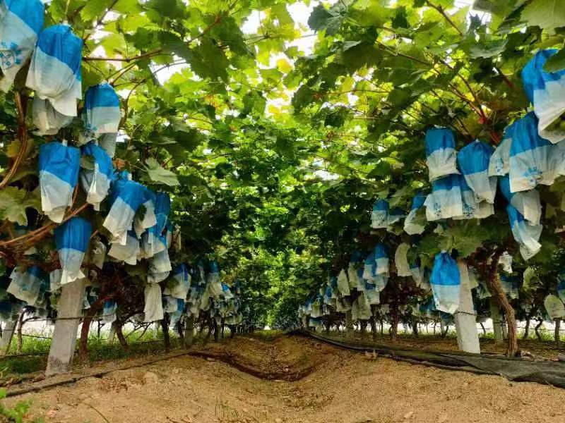 走進該村村民王現(xiàn)啟的葡萄種植園,只見葡萄藤架被打理得井井有條,一串串瑪瑙似的葡萄讓人賞心悅目,濃郁的葡萄香氣縈繞鼻尖。王現(xiàn)啟正仔細地拆開白色套袋,查看葡萄成熟度,熟練地用剪刀將成熟的葡萄剪下。