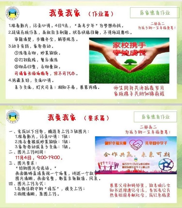 學(xué)生在家,家長(zhǎng)是監(jiān)督員。為了加強(qiáng)家長(zhǎng)的配合意識(shí),學(xué)生返家的第一個(gè)線(xiàn)上家長(zhǎng)會(huì)上,我們就讓各班傳達(dá)家長(zhǎng)監(jiān)督配合的重要性,家長(zhǎng)是老師的教育合伙人、同道人,安排家長(zhǎng)網(wǎng)課期間做好孩子的后勤保障,為學(xué)生創(chuàng)造一個(gè)安靜的學(xué)習(xí)環(huán)境。為了提高家長(zhǎng)的教育能力,我們配合家長(zhǎng)學(xué)校組織各班家長(zhǎng)參與網(wǎng)上學(xué)習(xí),要求家長(zhǎng)拍學(xué)習(xí)照片。鼓勵(lì)學(xué)生學(xué)習(xí)之余參與家務(wù)勞動(dòng),幫家長(zhǎng)洗衣、作飯、打掃衛(wèi)生,讓家長(zhǎng)體會(huì)到咱們的三為教育成果,從而更有信心的參與到學(xué)生管理中來(lái)。