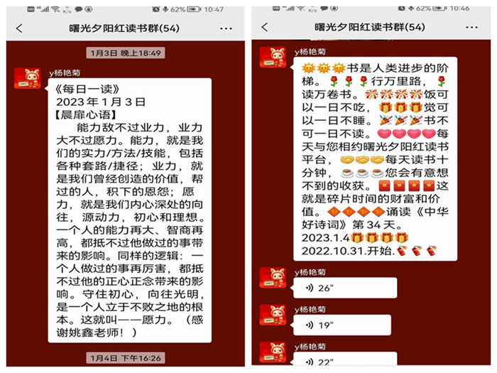 中新河南網(wǎng)3月7日電 安陽市北關(guān)區(qū)曙光辦事處老體協(xié)不斷創(chuàng)新文體活動方式,建立了《曙光夕陽紅讀書群》,開展了適合所有老年朋友的微信打卡讀書活動。很多老年朋友積極參與,特別是老體協(xié)執(zhí)行主席楊艷菊,不僅帶頭在群里誦讀《中華好詩詞》《習近平金句》《弟子規(guī)》《了凡四訓》等傳統(tǒng)文化書籍,并且毎天在群里推送正能的《每日一讀》,活動受到了老年朋們的一致好評,特別是疫情封控期間,為大家單調(diào)的生活帶來了色彩。