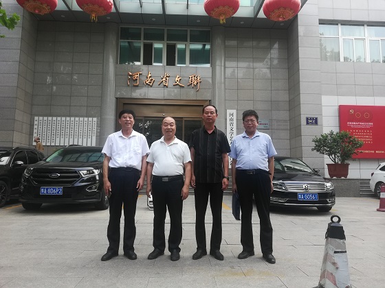 淅川范蠡研究會(huì)考察組與河南省民間文藝家協(xié)會(huì)秘書(shū)長(zhǎng)劉炳強(qiáng)(左二)在河南省文聯(lián)門(mén)前合影