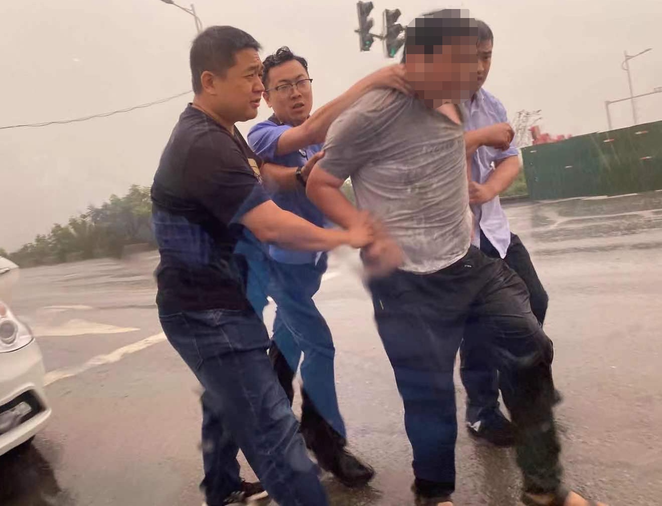在將其扭拽上警車后,執(zhí)行干警這才發(fā)現(xiàn)自己全身已經(jīng)被雨水澆透。