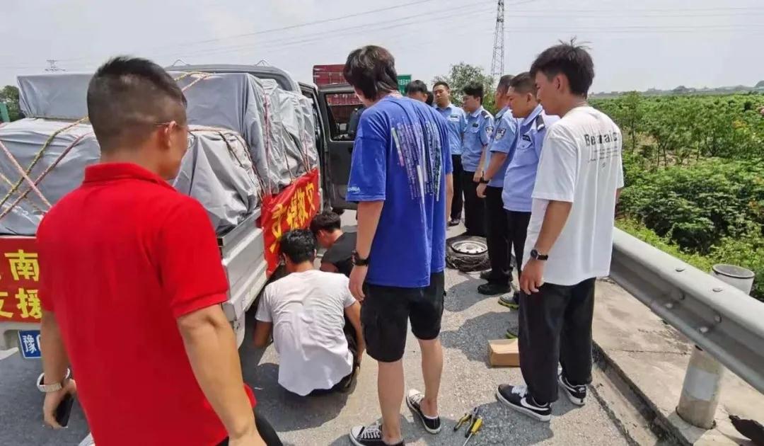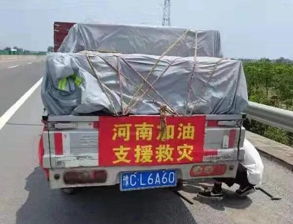 中新河南網7月27日電(王清平)2021年7月25日,輝縣市人民法院根據市委、市政府的工作安排,繼續(xù)執(zhí)行受災群眾的安置轉移工作。在從獲嘉縣返回輝縣市的高速上,遇到一輛載滿支援河南物資的車停在半路,有人在路邊揮手求助。我院干警立即靠邊停車,待查看后,原來是車輪胎爆胎,備胎也沒氣了。了解這一情況后,武剛、段典均及另外三名干警將備胎帶下高速充氣,在返回高速送還并協(xié)助將輪胎安裝好后,目送他們安全離開。