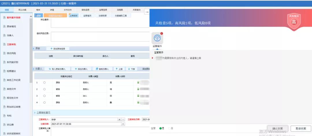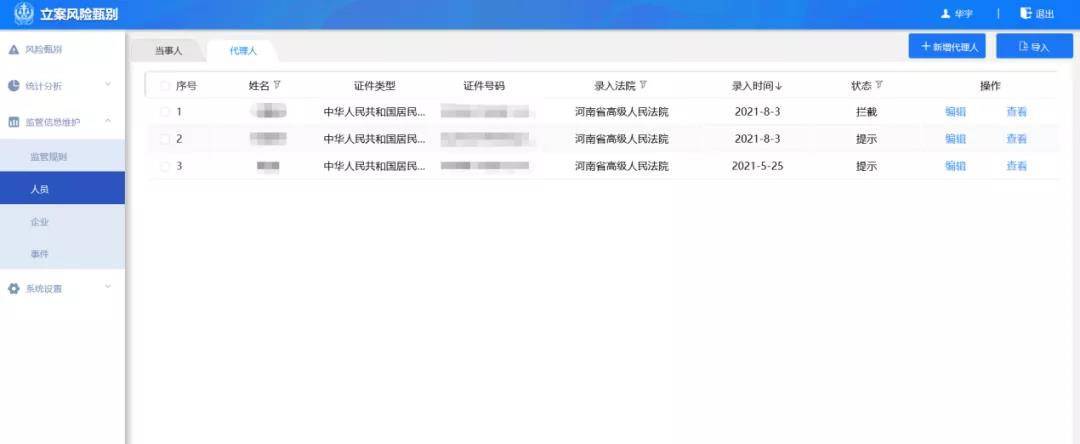當(dāng)各級(jí)法院立案部門工作人員在錄入案件代理人、辯護(hù)人等基本信息時(shí),系統(tǒng)會(huì)進(jìn)行立案風(fēng)險(xiǎn)篩查,一旦發(fā)現(xiàn)案件代理人、辯護(hù)人為法院離職人員時(shí),自動(dòng)進(jìn)行信息比對(duì),對(duì)違規(guī)代理本院案件或違反禁業(yè)限制規(guī)定代理案件的人員,直接進(jìn)行攔截操作;在案件辦理過程中,變更代理人、辯護(hù)人等基本信息時(shí),系統(tǒng)會(huì)提醒法官該案件存在違規(guī)代理風(fēng)險(xiǎn),應(yīng)及時(shí)告知當(dāng)事人更換訴訟代理人或辯護(hù)人,強(qiáng)化法院離職人員從業(yè)限制期內(nèi)監(jiān)督管理。