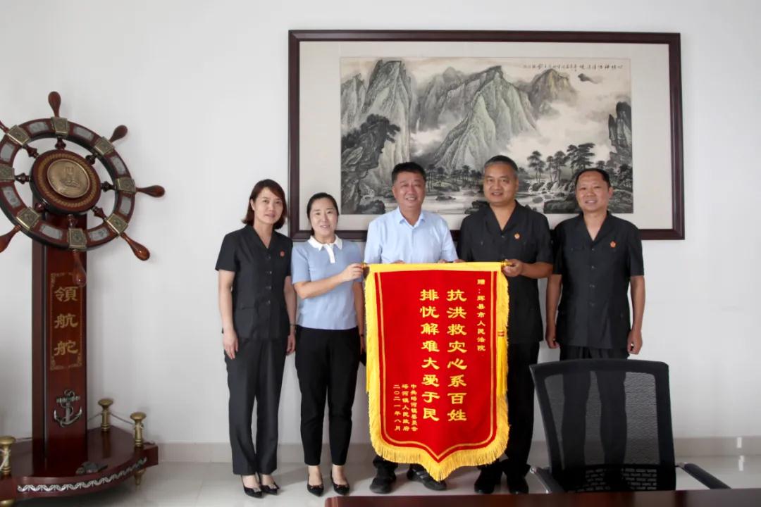 中新河南網(wǎng)8月23日電(王清平)8月18日上午,輝縣市峪河鎮(zhèn)黨委書記侯志軍、鎮(zhèn)長司月蓮等人為輝縣市人民法院送來一面錦旗,上面寫著“抗洪救災(zāi)心系百姓排憂解難大愛于民”,以表示對(duì)輝縣法院救助峪河鎮(zhèn)受災(zāi)群眾的感謝。