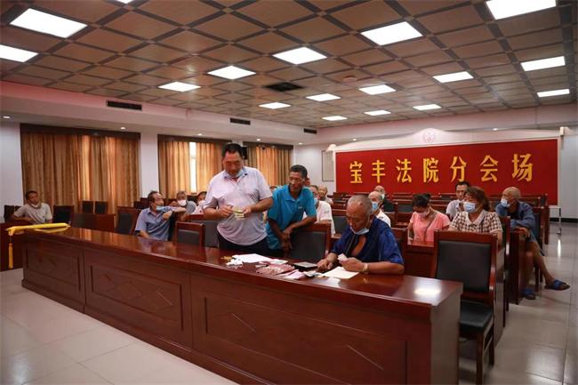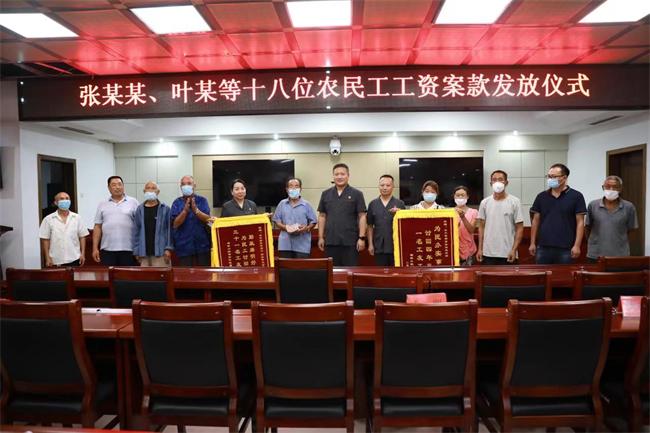 中新河南網(wǎng)7月20日電(陳銳峰)7月19日上午,在寶豐縣人民法院六樓會(huì)議室舉行張某某、葉某等18位農(nóng)民工工資案款發(fā)放儀式,寶豐法院黨組書記、院長李明參加儀式并將90000余元工資款交與原告,張某某等人激動(dòng)地握著李明院長的手說:“太感謝你們了,我們要了四年的錢沒有結(jié)果,經(jīng)你們寶豐法院調(diào)解不到10天我們就收到錢了......”