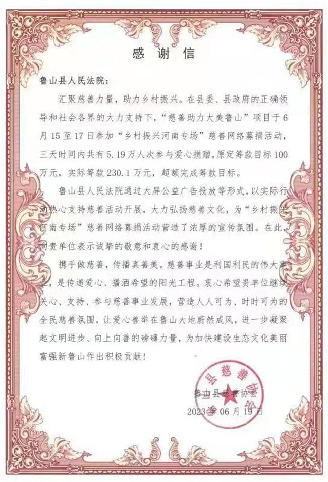 魯山縣法院收到一封來自縣慈善協(xié)會的感謝信