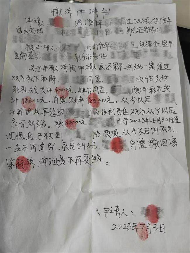 案件受理后,承辦法官與雙方幾番溝通,確認(rèn)二人感情破裂、無(wú)和好可能情形后,從雙方交往情況、共同生活時(shí)間、來(lái)往轉(zhuǎn)賬明細(xì)、本地風(fēng)俗習(xí)慣等方面綜合考量,向雙方釋法明理,充分講解民法典相關(guān)規(guī)定,促使雙方就返還彩禮數(shù)額達(dá)成一致。最終,被告王某向原告孫某返還彩禮款40000元、退還“三金”首飾,原告孫某申請(qǐng)撤訴,兩家矛盾就此化解。