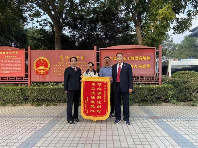 中新河南網(wǎng)(王柯雅)10月17日,被告楊某、徐某將一面印著“傾心調(diào)解化糾紛,秉公執(zhí)法暖民心”的錦旗送到了寶豐縣人民法院立案庭,對(duì)法官秉公辦案、高效調(diào)解表達(dá)感激之情。原來,近日寶豐法院通過訴前保全措施在訴前高效化解了一起民間借貸糾紛。