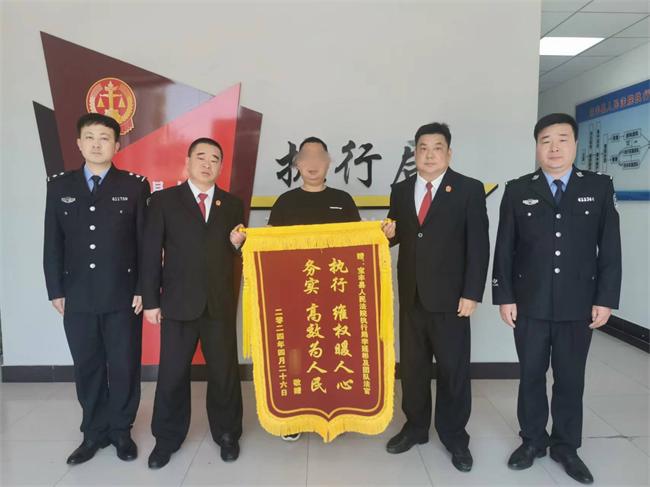 進入執(zhí)行程序后,執(zhí)行干警認真查閱卷宗、梳理案情,第一時間向被執(zhí)行人王某送達執(zhí)行通知書、報告財產(chǎn)令等法律文書,敦促其履行義務(wù)、報告財產(chǎn)。與此同時,執(zhí)行干警通過“總對總”線上查控系統(tǒng)對王某名下的財產(chǎn)進行查詢。據(jù)系統(tǒng)反饋,王某名下無任何可供執(zhí)行的財產(chǎn),并且李某也無法提供王某的行蹤及財產(chǎn)線索,案件一度陷入了僵局。“難度再大也要寸步不讓,標的再小也要分毫必爭”。李延彬巧妙地研究對策、制定方案,帶領(lǐng)團隊干警不厭其煩地于不同時段多次奔赴被執(zhí)行人王某可能去的落腳點實地調(diào)查。功夫不負有心人,在一次執(zhí)行行動中,終于查找到王某的下落,面對如同神兵天降的執(zhí)行干警,滿臉錯愕的王某終于明白如何處心積慮地東躲西藏也最終難逃正義的天羅地網(wǎng)。王某隨即被依法拘傳至寶豐法院,在執(zhí)行干警耐心地釋法明理及強大的執(zhí)行震懾下,王某當場將數(shù)萬元案款全部履行完畢。收到案款后,申請人李某難掩激動之情,“我本來對這筆錢都不報啥希望了,沒想到為我這點兒錢,讓咱寶豐法院執(zhí)行局的同志們跑了這么多趟,費了這么多心,你們真是咱老百姓的貼心人、守護神”。第二天清晨,申請人李某早早地來到寶豐法院送錦旗,便有了開頭的一幕。