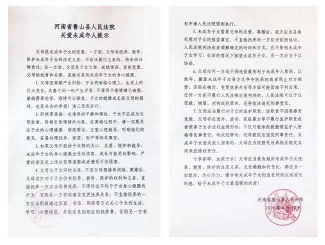 這是自4月15日最高人民法院發(fā)布《關于在涉及未成年子女的離婚案件中開展“關愛未成年人提示”工作的意見》后,魯山縣法院發(fā)出的首份《關愛未成年人提示》,著重保護未成年人合法權益,將關愛未成年人精神貫徹落實到案件辦理中。