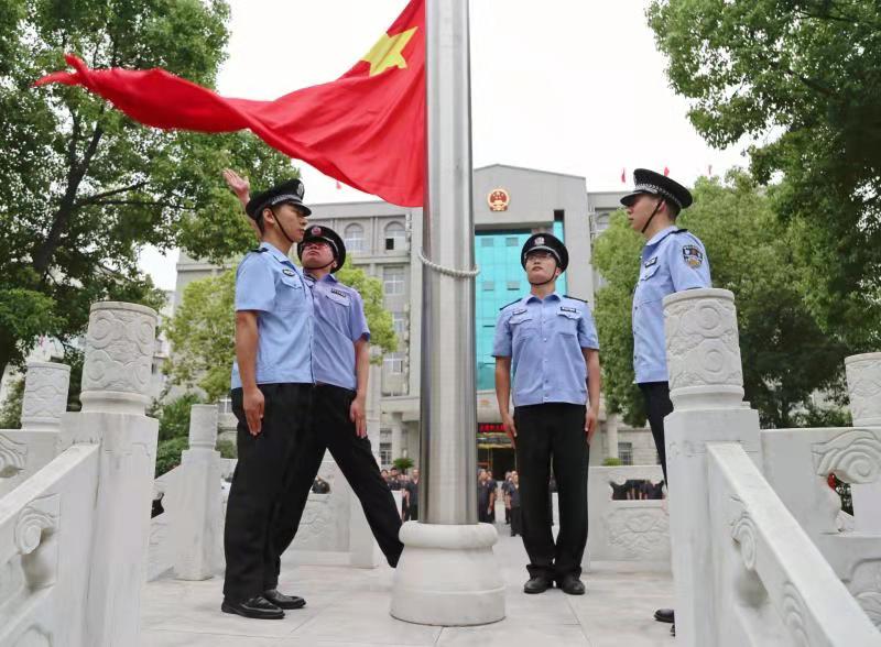 上午8時,升旗儀式開始,院國旗護衛(wèi)隊邁著鏗鏘有力的步伐走向升旗臺,伴隨著雄壯的《義勇軍進行曲》,鮮艷的五星紅旗冉冉升起,迎風飄揚,全體干警莊嚴肅立,向國旗行注目禮。