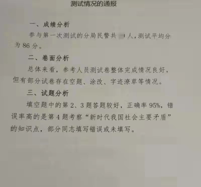 二是堅持考試考風(fēng)的嚴肅性。每次測試安排專人出題,嚴格落實試卷保密要求,嚴明考場考風(fēng)考紀?荚嚱Y(jié)束對試卷實行嚴格認真批閱,并印發(fā)《應(yīng)知應(yīng)會知識測試分析報告》,確?荚囌姘l(fā)現(xiàn)問題、發(fā)現(xiàn)真問題。帶動民警自覺查漏補缺,及時“補課”主動“補考”,確保學(xué)習(xí)教育扎扎實實,不走過場。