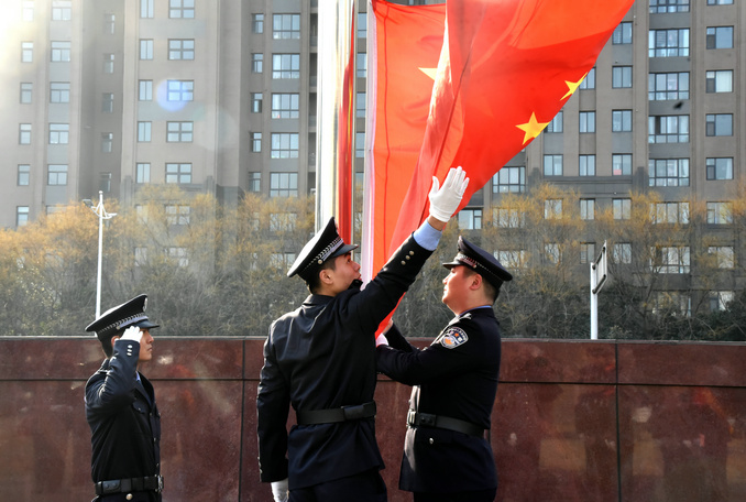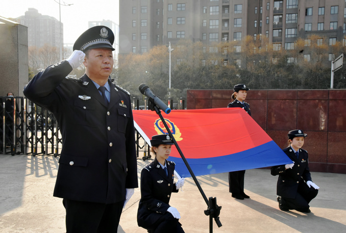 伴隨著雄壯激昂的國歌聲,鮮艷的五星紅旗冉冉升起,全體民警警容嚴(yán)整、肅然而立,向國旗敬禮。
