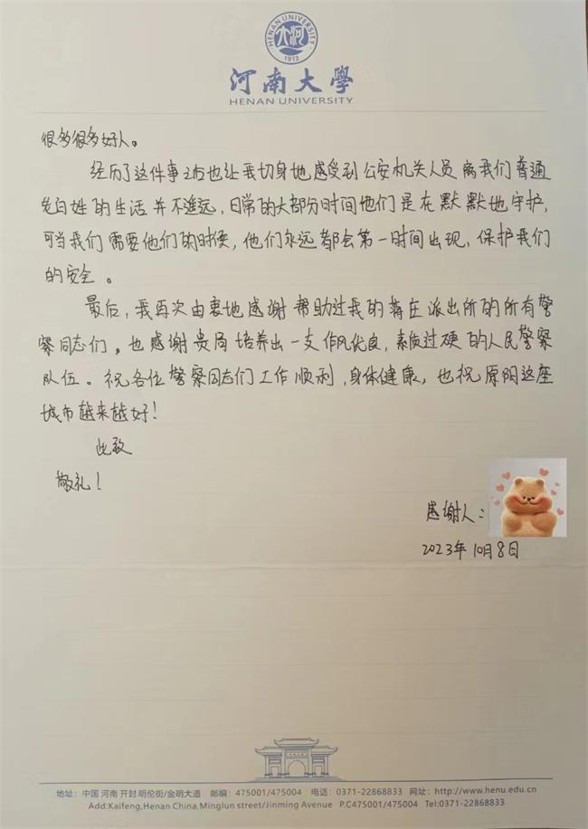中新河南網(吳淑冉)近日,原陽縣公安局收到一封來自河南大學一名學生的信件,內含一封手寫感謝信,字里行間的紙短情長、情真意切,這些包含深情的贊許和鼓勵既是對原陽警方辛勤付出的高度認可,也是激勵民輔警再接再厲的強大動力。