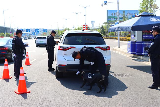 鄭州機(jī)場(chǎng)迎賓高架的上橋口,一輛特警裝甲車駐扎在馬路一側(cè),寫有“前方治安卡點(diǎn),請(qǐng)配合檢查”幾個(gè)大字的提示牌格外顯眼,這里是駛?cè)豚嵵菪锣崌?guó)際機(jī)場(chǎng)的第一道“屏障”,警犬“坦克”和“小武”正在開展搜爆工作。