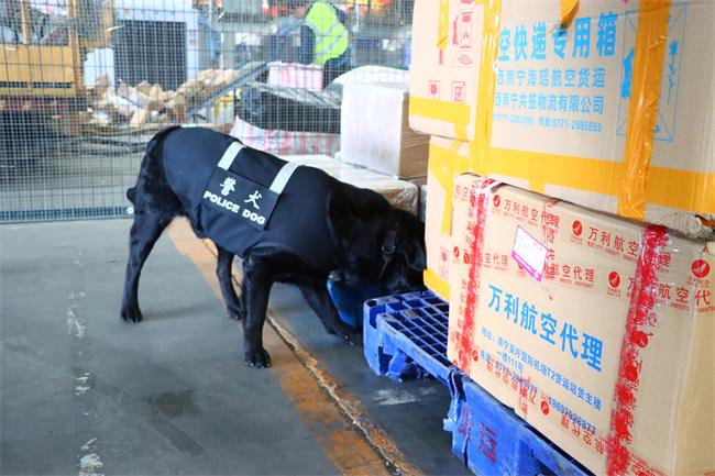 “多多”今年4歲半,是一只黑色的拉布拉多犬,它嗅覺靈敏,反應(yīng)迅速。檢查過程中,訓(xùn)導(dǎo)員注重發(fā)揮警犬作用,帶領(lǐng)訓(xùn)練有素的“多多”在一堆堆貨品包裹中逐一嗅辨,排查是否有毒品等違禁貨物。