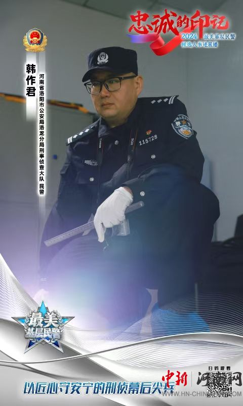 中新河南網(wǎng)(田波濤)1月10日,在第五個中國人民警察節(jié)到來之際,中央宣傳部、公安部向全社會發(fā)布20名2024全國“最美基層民警”當選者先進事跡。河南省推薦的候選人洛陽市公安局洛龍分局刑事偵查大隊民警韓作君當選2024全國“最美基層民警”。