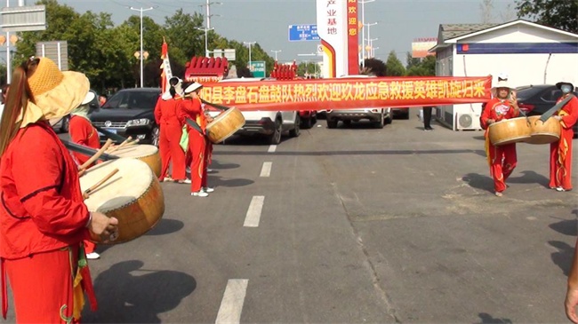 活動現(xiàn)場:盤鼓陣陣,獅舞翻騰,一條條寫著歡迎救援英雄凱旋歸來的條幅由歡迎隊伍沿路邊扯起,原陽縣中醫(yī)院派出的兩輛救護車及醫(yī)護人員早早在現(xiàn)場待命,原陽縣公安局交警隊民警也在現(xiàn)場指揮交通,幫忙維持秩序。多家媒體也派員到了現(xiàn)場。盡管當時天氣炎熱,氣溫接近四十度,但是依然掩蓋不了迎接人員更高的熱情。