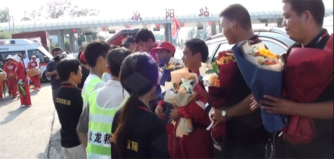 由社會各界組成的接隊代表和救援隊員家屬分別向救援英雄隊員們獻花,當?shù)貞?yīng)急局領(lǐng)導(dǎo)代表主管部門致歡迎鼓勵詞,盤鼓隊、舞獅隊為凱旋歸來的救援英雄們進行了精彩的表演。