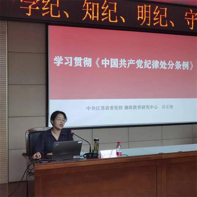 參觀完成后,黨員同志以黨課的形式共同對《條例》內(nèi)容進(jìn)行學(xué)習(xí),此次黨課由中共江蘇省委黨校廉政教育研究中心副主任、副教授,法學(xué)博士,碩士生導(dǎo)師孫樂艷進(jìn)行授課。課上孫教授從《條例》的修訂背景及歷史沿革、修訂的重大意義、新修訂《條例》的特點(diǎn)、貫徹《條例》的具體要求等方面對《條例》進(jìn)行了詳細(xì)剖析,引導(dǎo)黨員持續(xù)增強(qiáng)紀(jì)律意識、強(qiáng)化紀(jì)律執(zhí)行。