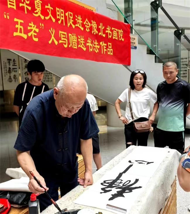 他們每天自帶筆墨、氈布、紙張,從九點(diǎn)一直書(shū)寫(xiě)到11點(diǎn),一幅幅親手書(shū)寫(xiě)的書(shū)法作品贈(zèng)送到群眾手中,感動(dòng)著人們,每個(gè)同志汗水在臉上流淌,忘記了疲勞,受到廣大民眾的贊揚(yáng),充分體現(xiàn)了五老書(shū)畫(huà)家健康向上,老有所樂(lè)、老有所為余熱生輝的奉獻(xiàn)精神。