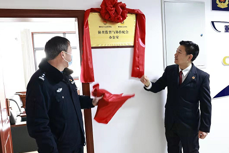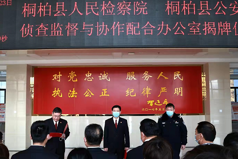 桐柏縣檢察院檢察長王玉新、縣公安局黨委成員、副局長孫強共同為偵查監(jiān)督與協(xié)作配合辦公室揭牌。