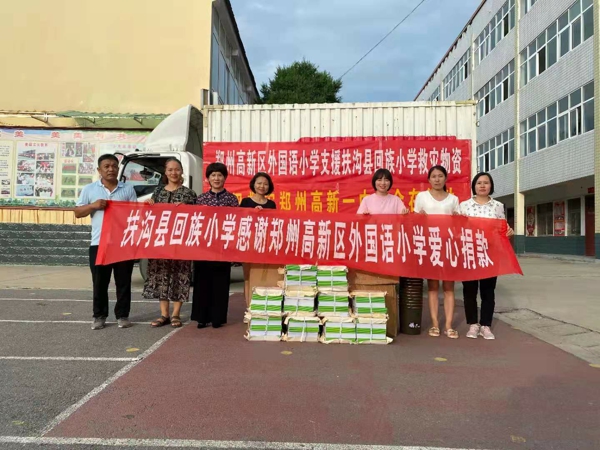 鄭州高新區(qū)外國(guó)語(yǔ)小學(xué)在抗汛救災(zāi)、修復(fù)學(xué)校的同時(shí),也關(guān)注抗洪動(dòng)向,在得知周口扶溝地區(qū)受災(zāi)嚴(yán)重之后,便向扶溝縣回族小學(xué)伸出了援助之手。外國(guó)語(yǔ)小學(xué)和周口扶溝縣回族小學(xué)早在2016年就結(jié)下了深厚的友誼,幾年間,外小先后派遣優(yōu)秀教師前往扶溝縣回族小學(xué)支教,輸出先進(jìn)的育人理念與課堂教學(xué)模式;扶溝縣回族小學(xué)先后有多位老師來(lái)外小參觀學(xué)習(xí),并把“出彩精神”帶給扶溝縣的孩子。7月26日,外國(guó)語(yǔ)小學(xué)委派萬(wàn)艷娜老師為援助使者,帶著一批體育器材、學(xué)習(xí)用品及救援物資,奔赴周口扶溝縣,為同樣受災(zāi)的扶溝縣回族小學(xué)送上外小的牽掛和關(guān)懷。