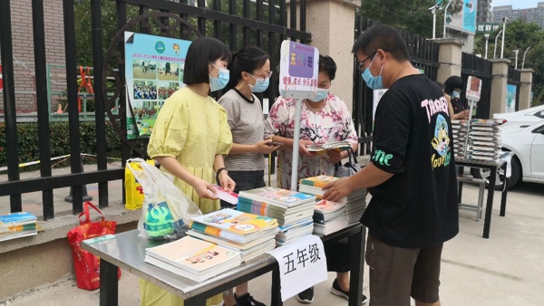 8月26日,二至六年級各班班主任結(jié)合小區(qū)分布和就近原則,通知各班3--5位家長代表,準(zhǔn)時(shí)來到學(xué)校領(lǐng)書地點(diǎn)。一大早,教務(wù)處和安保處現(xiàn)場指導(dǎo)教材發(fā)放與防疫工作,并維持現(xiàn)場秩序。家長代表全程佩戴醫(yī)用防護(hù)口罩,聽從各班班主任及安保人員的指揮,測溫消毒、有序領(lǐng)取教材,力爭最大限度避免人員接觸,做到即拿即走,不在學(xué)校逗留。提前發(fā)放教材,解決學(xué)生居家線上學(xué)習(xí)的需求,確保線上教學(xué)工作的順利、有效地開展。