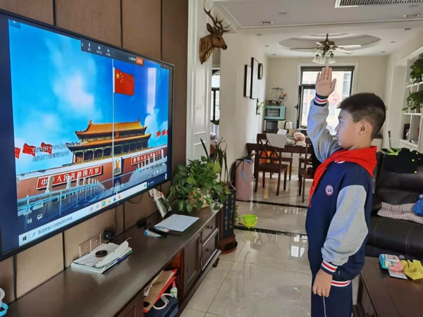 少先隊(duì)員在中隊(duì)輔導(dǎo)員的積極組織下,準(zhǔn)時(shí)進(jìn)入了班級(jí)線上升旗直播。當(dāng)視頻中雄壯的國(guó)歌奏響、鮮艷的五星紅旗冉冉升起時(shí),少先隊(duì)員神情嚴(yán)肅,挺胸抬頭目視國(guó)旗,情不自禁唱起了國(guó)歌,心中充滿了無(wú)限的憧憬和展望。隨后,大家共同觀看了少先隊(duì)員為老師精心錄制的慶祝教師節(jié)視頻:《老師,您辛苦了》。少先隊(duì)員用情真意切的話語(yǔ),表達(dá)了對(duì)老師的深深感恩之情,使老師感受到了節(jié)日的溫馨。少先隊(duì)員代表劉安澤無(wú)不感慨地說(shuō):“加減乘除,算不盡老師的無(wú)私奉獻(xiàn);詩(shī)詞歌賦,頌不完對(duì)老師的滿懷崇敬,感謝老師,給了我們放眼世界的慧眼,感謝老師,幫我們指明人生的方向。”