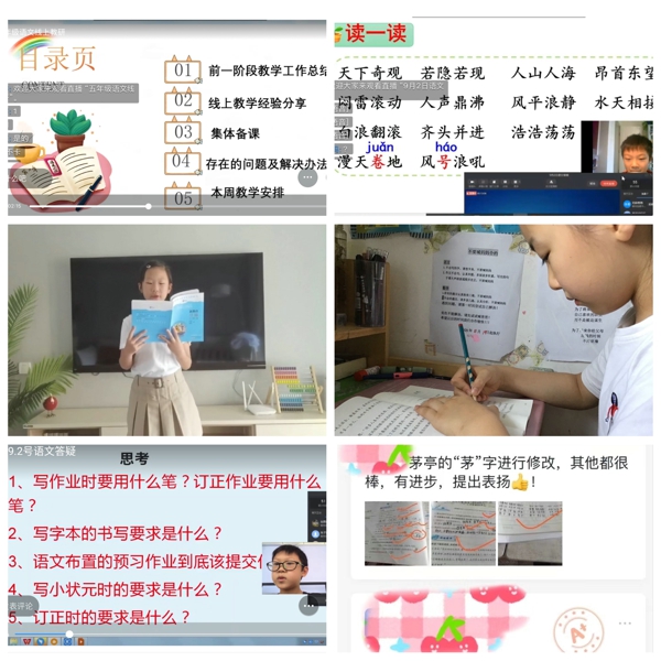 語(yǔ)文組共享教學(xué)資源,認(rèn)真研讀教材、集體在線(xiàn)研討、精心制作課件。晨曦誦讀,與黎明共舞,領(lǐng)略母語(yǔ)的魅力,積累優(yōu)美語(yǔ)言文字;陽(yáng)光午讀,師生共讀經(jīng)典,豐富精神內(nèi)涵;線(xiàn)上課程、答疑互動(dòng),打造高效出彩課堂,讓孩子們樂(lè)學(xué)善思,學(xué)有所獲,出彩成長(zhǎng)每一天。