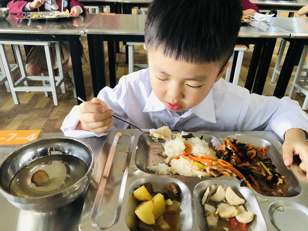 中午,豐盛的午餐已經(jīng)早早準(zhǔn)備好,同學(xué)們在老師們的帶領(lǐng)下間隔而坐,品味美食,心懷感恩。
